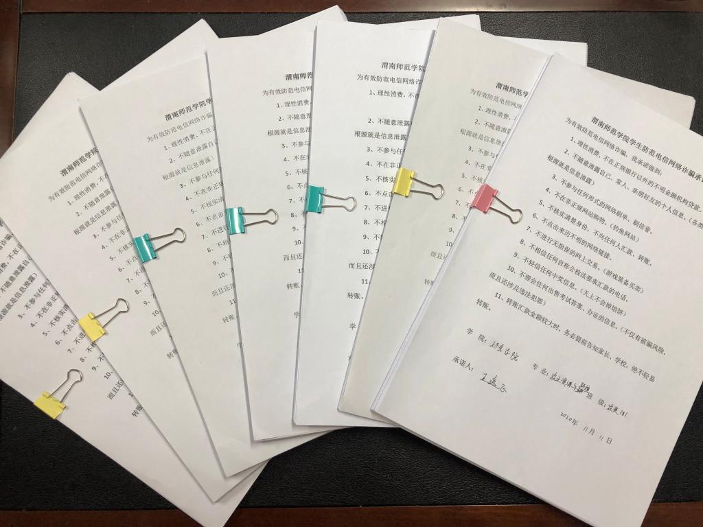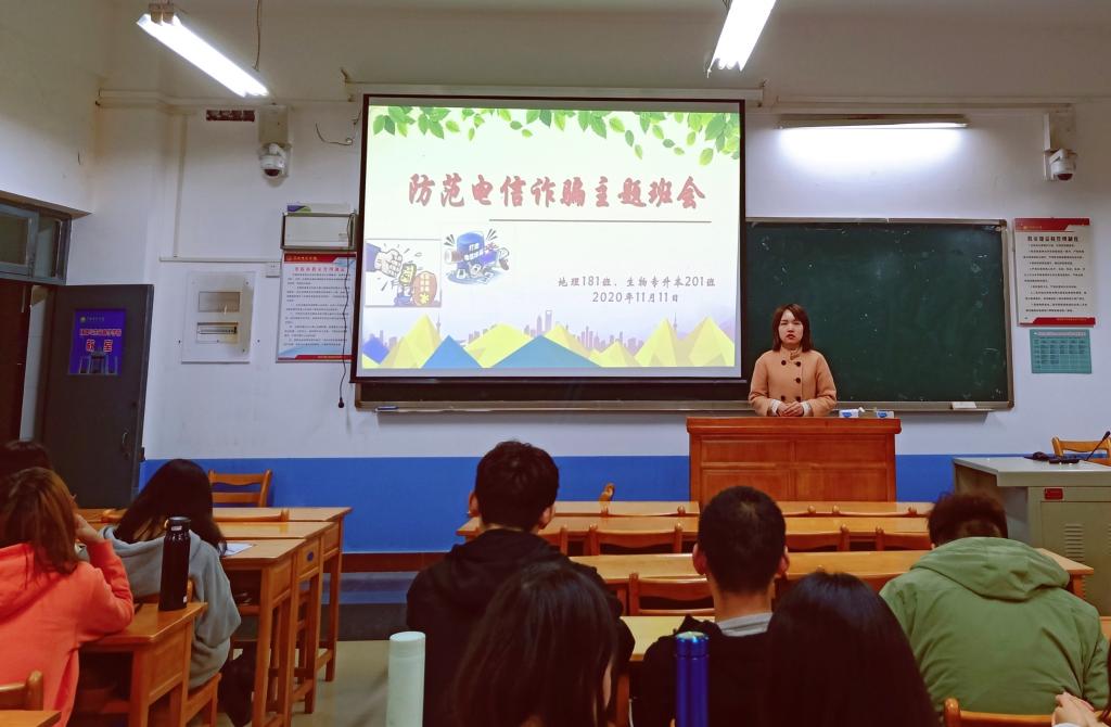 11月11日至18日,各班辅导员组织开展防范电信网络诈骗主题班会。通过PPT宣讲、案例分析、观看视频、互动交流等方式,对常见的电信网络诈骗形式、如何有效预防电信网络诈骗等内容进行了讲解,通过发生在校园的真实案例,让学生对电信网络诈骗有了深刻的认识。并组织全体学生签订《渭南师范学院学生防范电信网络诈骗承诺书》。