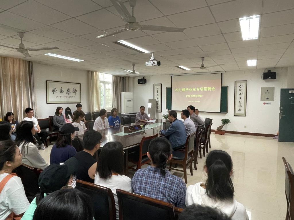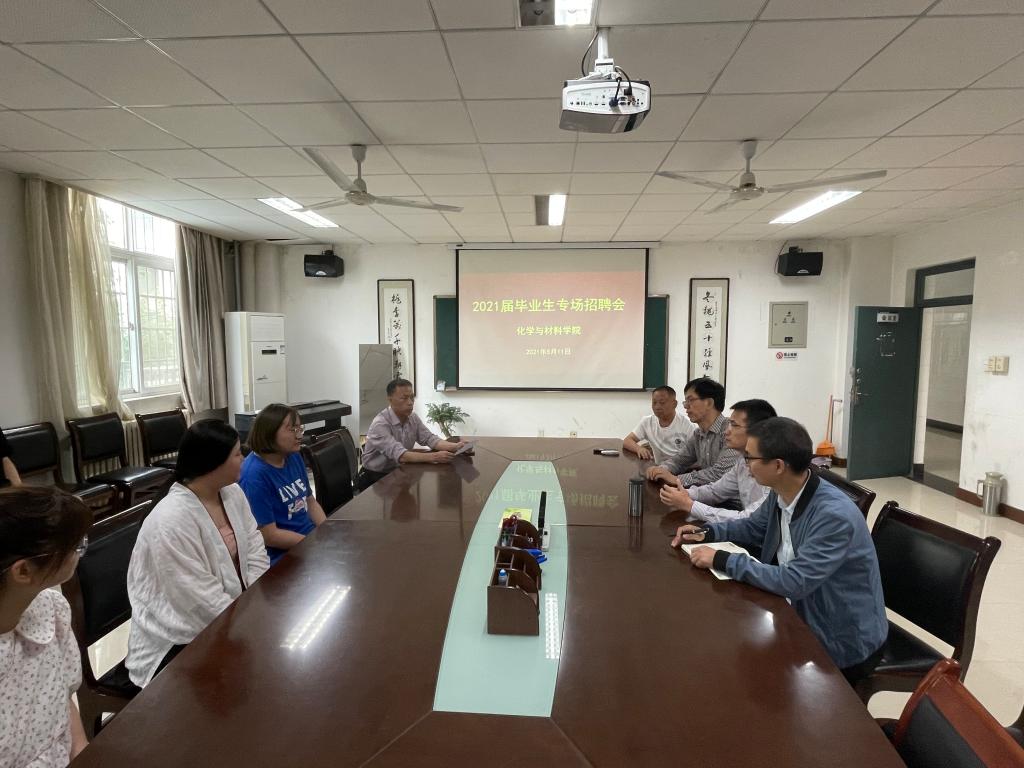 5月11日上午,化学与材料学院举办2021届毕业生第四场专场招聘会,学院党总支书记韩城忠、学院院长焦更生、专职辅导员刘泽林以及60余名2021届毕业生参加本次招聘会。