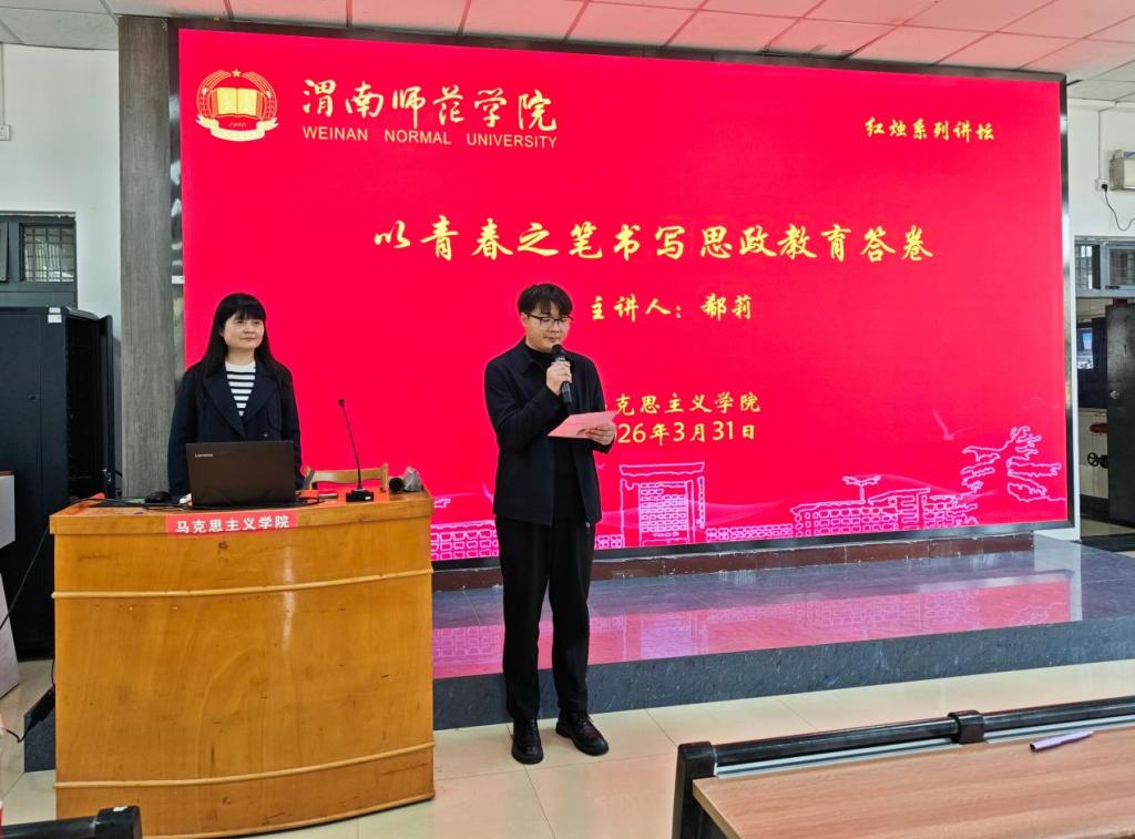 3月31日下午,马克思主义学院特邀全国模范教师、享受国务院政府特殊津贴、正高级教师、渭南小学党支部书记兼校长郗莉在1101教室作题为“以青春之笔书写思政教育答卷”的专题报告。2025级思想政治教育专业全体学生参加。报告由思想政治教育专业负责人周韶尉主持。