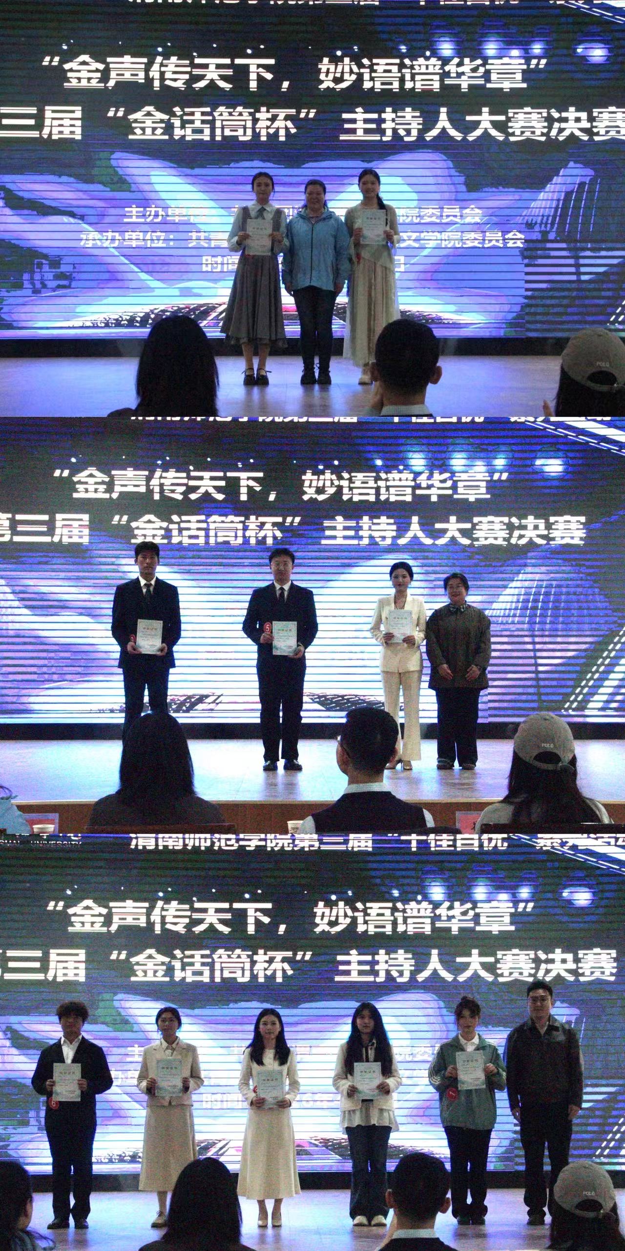 决赛十位选手分别进行了自我介绍、命题主持、即兴评述和才艺展示四个环节的比拼,全面考察选手的语言表达、临场应变、专业素养与综合才艺。在自我介绍环节,选手们各具特色,用简洁生动的语言展现自身风采与主持梦想,快速拉近与观众和评委的距离;命题主持环节中,选手们围绕不同主题,从容把控节奏、流畅表达内容,尽显扎实的主持功底与专业台风;即兴评述环节极具挑战性,选手们临场思考、快速反应,结合自身认知与思考,条理清晰地阐述观点,展现出敏捷的思维与出色的语言组织能力;最后的才艺展示环节,选手们各展所长,用多样的艺术形式释放青春活力,为比赛增添了别样风采。