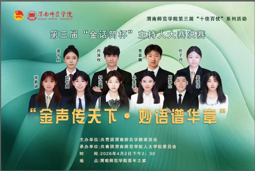 4月2日下午,由共青团渭南师范学院委员会主办,人文学院团委承办的我校第三届“十佳百优”系列活动—“金话筒”主持人大赛决赛在朝阳校区红旗大礼堂举办。党委宣传部副部长石明、校团委副书记任晓婷、人文学院党总支副书记王昱等出席活动。评委由渭南师范学院学报编辑部编审詹歆睿、校团委组织宣传办公室副主任伍萌、莫斯科艺术学院团委副书记崔萌担任。