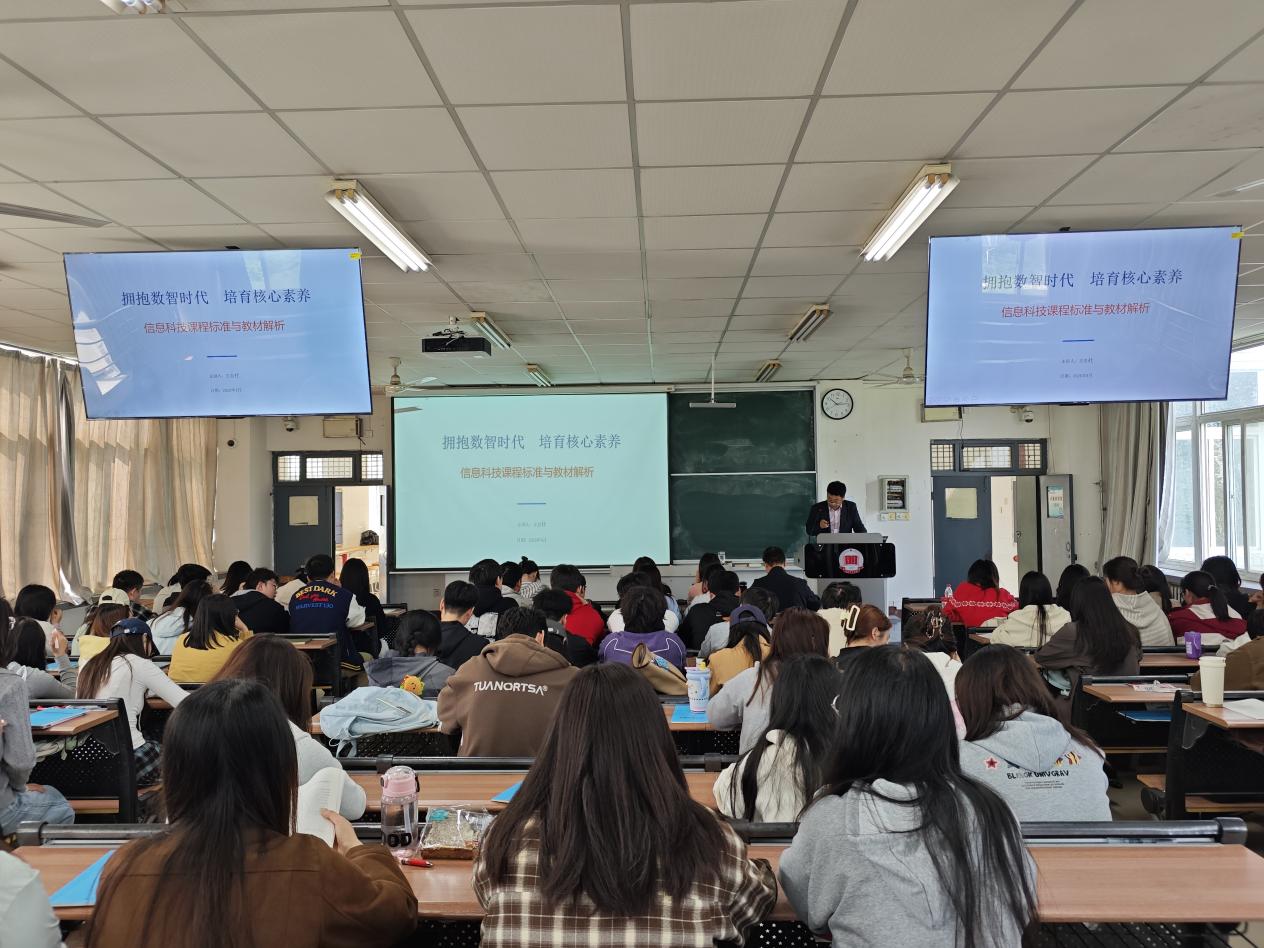 王忠社围绕信息科技课程改革背景、新课程标准核心框架、学科核心素养内涵、现行教材编排逻辑与教学实施重难点等多个维度,展开条理清晰、内容翔实的深度解析。讲座结合数智时代教育变革的大趋势,系统拆解了信息科技课程的育人目标、学段能力进阶要求、跨学科融合教学路径等关键内容,通过鲜活的教学案例、前沿的行业发展数据,直观展示了新课标、新教材对信息科技专业学习者提出的全新能力要求与发展方向。