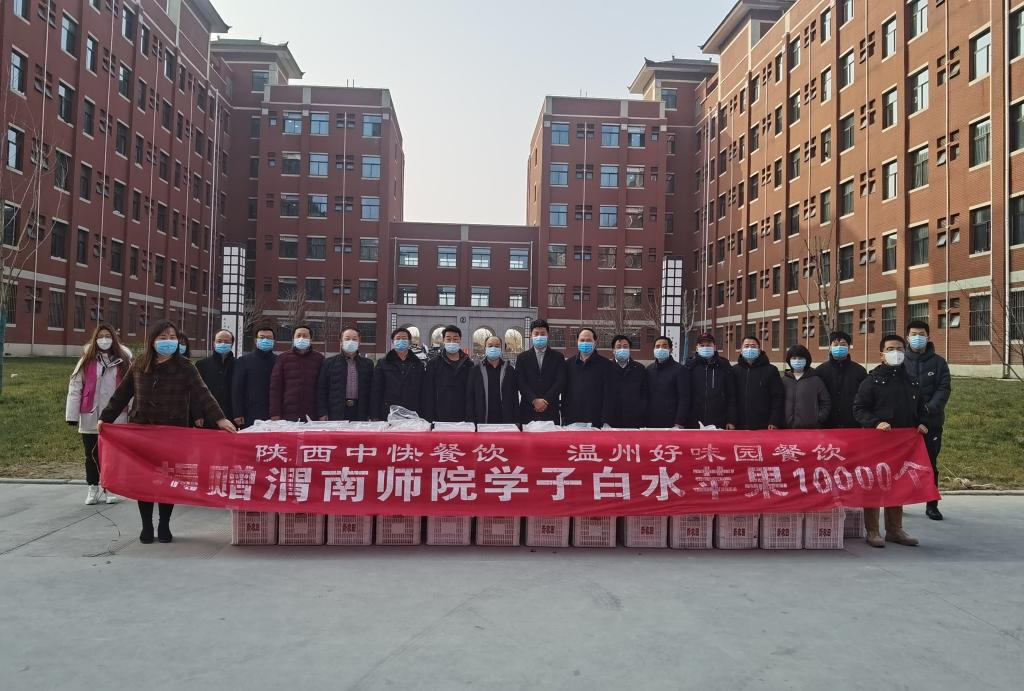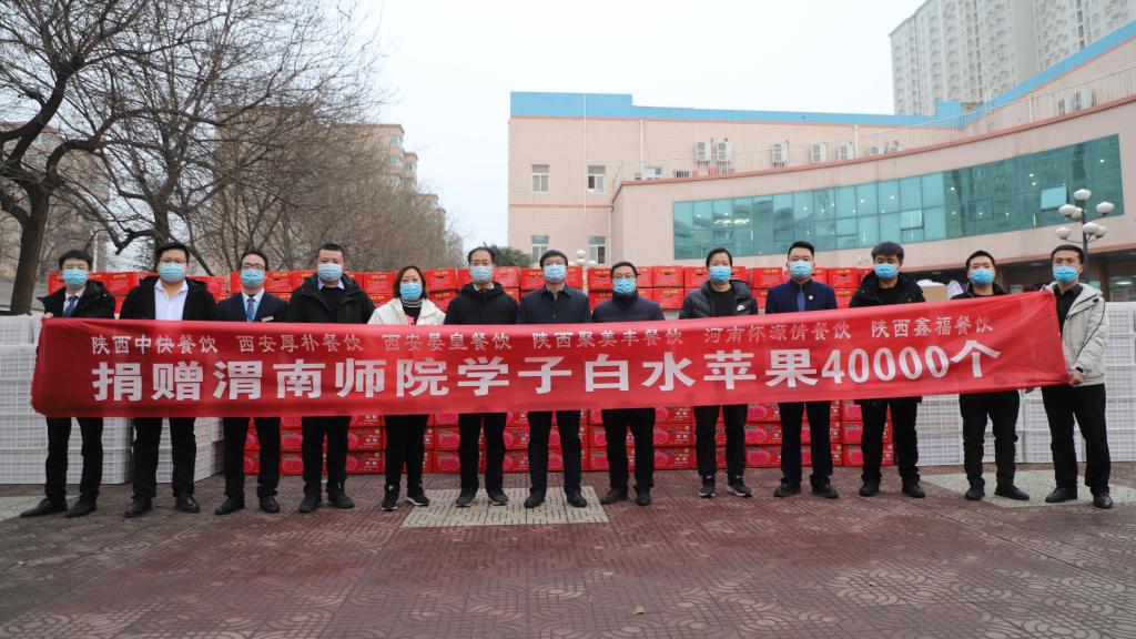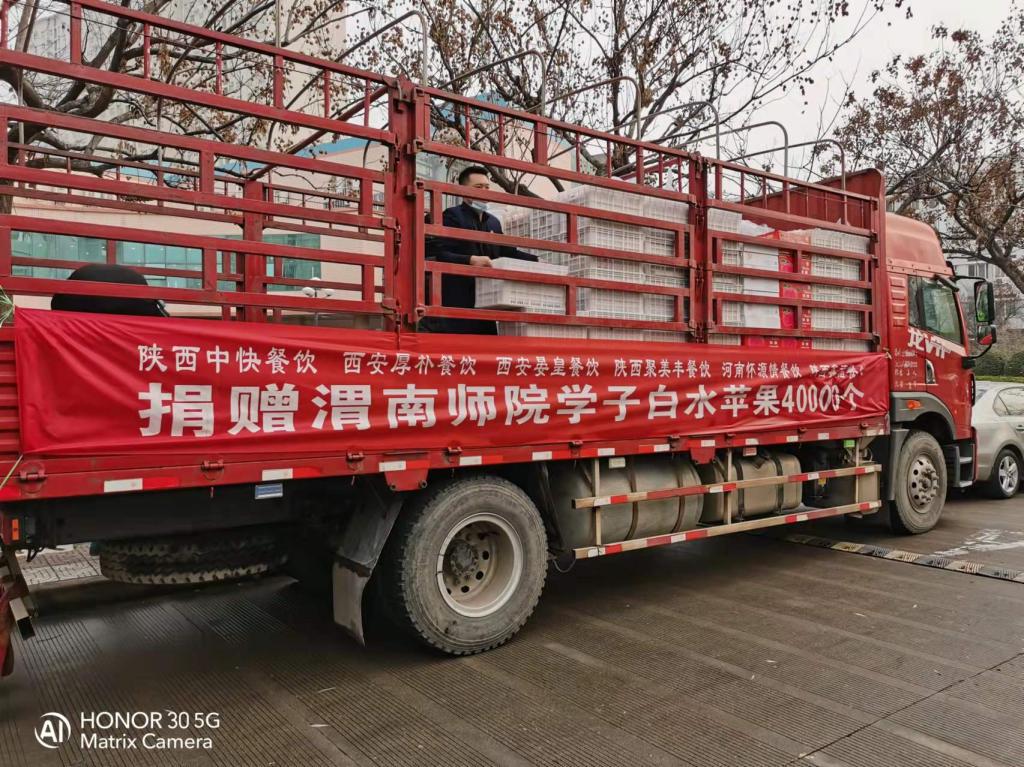 1月8日 ,一辆满载“爱心苹果”的车辆驶入渭师校园。在全校师生齐心协力共同抗击疫情之际,由陕西中快餐饮管理有限公司、西安厚朴餐饮管理有限公司、西安晏皇餐饮管理有限公司、陕西聚美丰餐饮集团公司、陕西鑫福餐饮管理有限公司、温州好味园餐饮管理公司、河南怀源情餐饮管理公司等企业向我校全体学生捐赠优质白水苹果4万个。