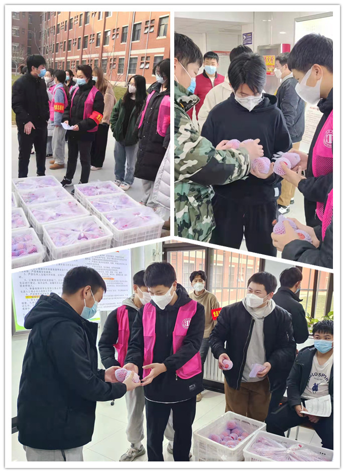 在富平校区学生公寓楼下,捐赠企业的工作人员与二级学院党员志愿者一起有序分工,将“苹”安“果”香,爱心传递到每一位渭师学子手中,祝愿我校校园平安,学子健康。