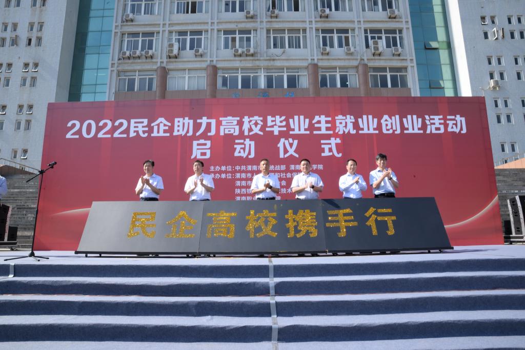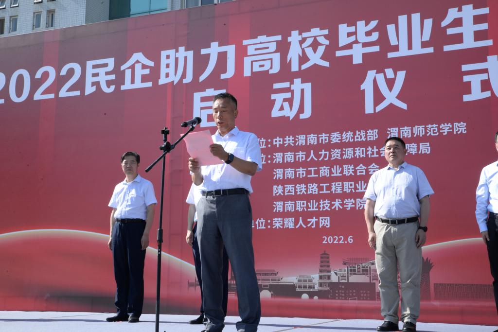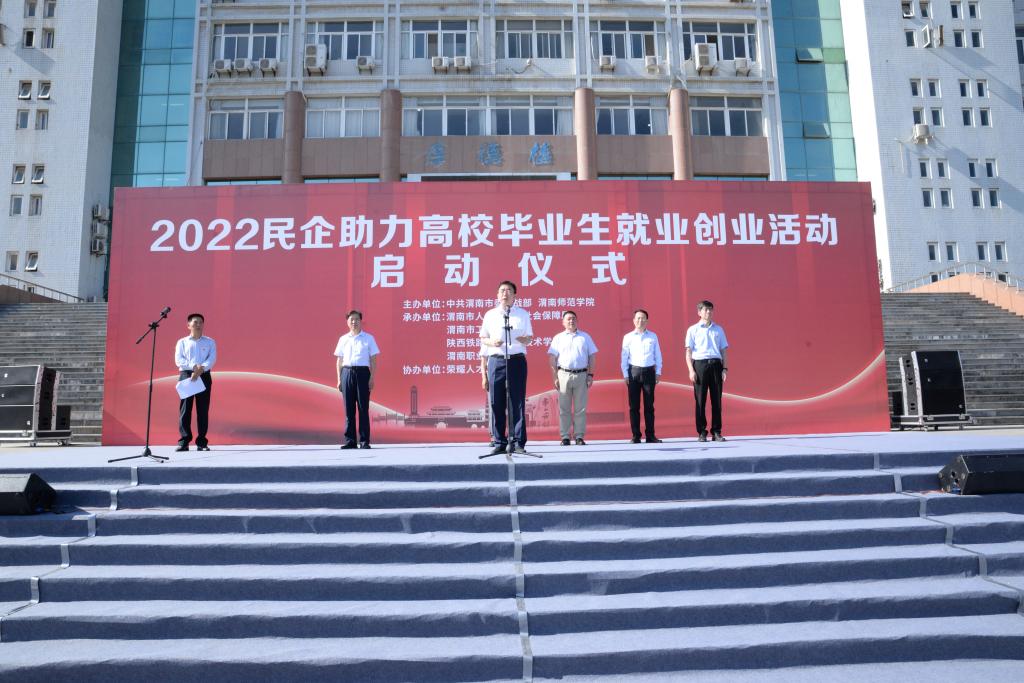 6月16日上午,学校与渭南市委统战部、渭南市人力资源和社会保障局、渭南市工商业联合会在学校名人广场联合举办“2022民企助力高校毕业生就业创业”活动启动仪式。启动仪式由渭南市统战部副部长、市工商业联合会党组书记吉渭强主持。