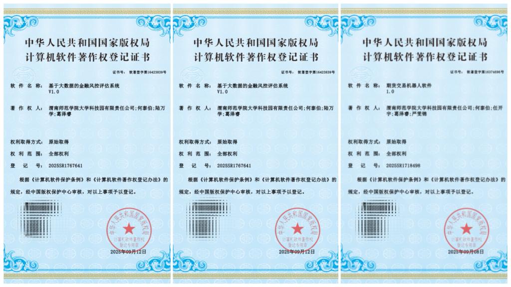 近日,我校大学科技园依托金融大数据量化策略研究中心平台,成功获批“金融大数据可视化分析系统”“基于大数据的金融风控评估系统”和“期货交易机器人软件”三项创新成果,成功获得国家版权局颁发的计算机软件著作权登记证书。