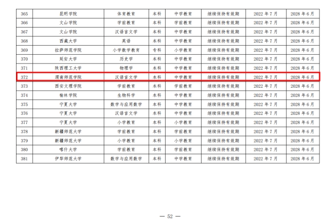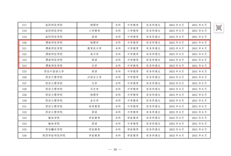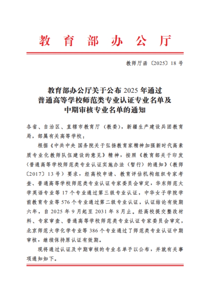 近日,教育部办公厅印发了《教育部办公厅关于公布2025年通过普通高等学校师范类专业认证及认证中期审核专业名单的通知》(教师厅函〔2025〕18号),公布了2025年通过普通高等学校师范类专业认证及中期审核的专业名单,我校物理学、教育技术学、美术学、化学、英语5个专业顺利通过师范类专业中学教育第二级认证,认证结论有效期六年,自2025年9月起至2031年8月止。汉语言文学专业通过中期检查,认证结论为继续保持有效期,自2022年7月起至2028年6月止。目前我校已有9个专业有条件通过师范类专业第二级认证。