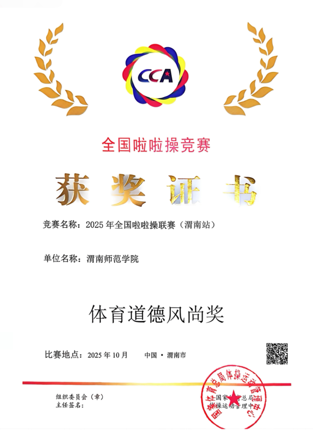 在学院的大力支持和领导下,由教练员王敏婷、龙丽娟带领的校啦啦操代表队凭借扎实的技术功底与出色的团队协作,一举斩获两大奖项:公开青年甲组花球规定动作(2025版)-初级A冠军、公开青年甲组集体花球自选动作冠军,同时获得体育道德风尚奖。