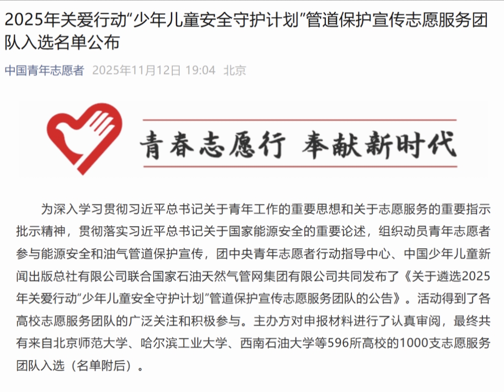 11月12日,团中央青年志愿者行动指导中心、中国少年儿童新闻出版总社有限公司联合国家石油天然气管网集团有限公司共同发布了2025年关爱行动“少年儿童安全守护计划”管道保护宣传志愿服务团队入选名单。我校美术学院“星火丹青管道护童志愿宣讲团”,入选国家级志愿服务团队。