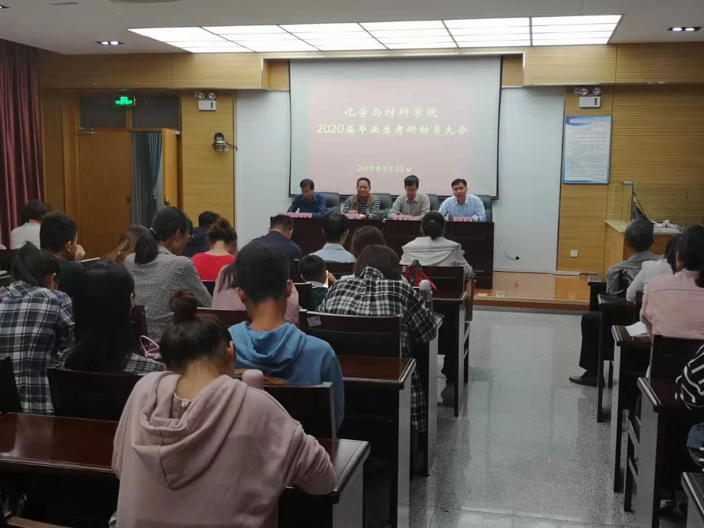 9月25日晚,化学与材料学院在逸夫楼科学大讲堂召开考研动员大会。该院院长焦更生、党总支副书记吕健、副院长刘展晴、22名考研指导教师、毕业班辅导员以及150名考研学生参加了此次会议,会议由该院副院长李吉锋主持。