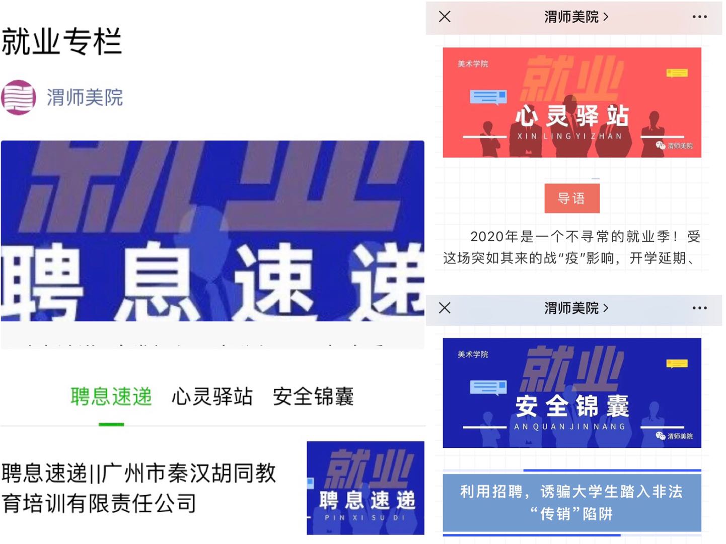 “细”化服务,搭建就业服务新平台。一是在“渭师美院”公众号上开辟就业专栏,设立“聘息速递”、“心灵驿站”、“安全锦囊”等栏目,分类开展线上服务:精准推送就业信息,力求招聘信息投送更加有效;分期进行大学生就业政策宣传,鼓励毕业生积极响应“特岗教师计划”“振兴计划”“西部计划”等国家基层就业项目;实行就业心理辅导,缓解毕业生心理压力,温馨提醒学生警惕求职陷阱、慎防求职诈骗等问题,为毕业生就业安全保驾护航。二是充分挖掘线上就业信息渠道,创新服务模式。学院内部借助各大招生就业微信公众号、QQ群、微信群等线上平台及时推送就业信息。三是毕业班辅导员采用多种线上形式围绕心理疏导、求职辅导、面试技巧、考研复试等话题对毕业生开展针对性辅导,努力做到思想引导和线上服务“不断线”。