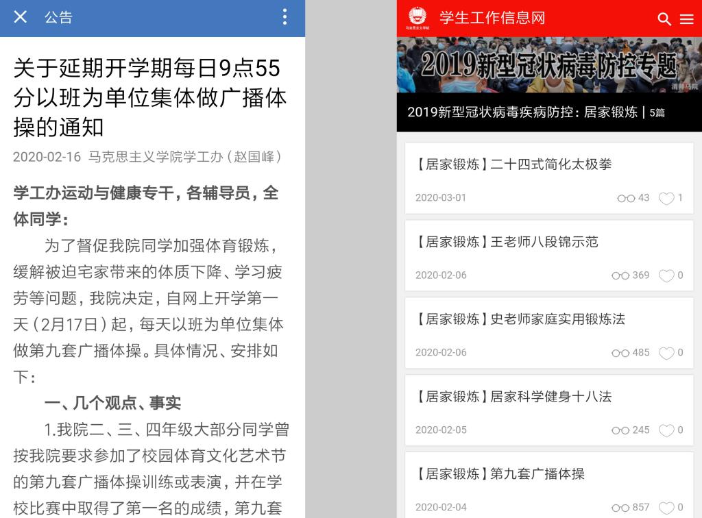 从2月2日开始,在学院学生工作信息网已经开设的“2019新型冠状病毒防控教育”专题网中创建了“居家锻炼”栏目,以适合室内或庭院、能够使全身得到适度活动、学生有基础或简单易学、来源权威或有吸引力为原则,目前已经陆续搜集整理、编发了五个(类)近70段适合在家锻炼的健身示范视频,倡议学生以此为依托,在居家不能外出期间学习健身方法,加强活动锻炼。其中包括:由国家体育总局编制,我校连年组织学生表演的第九套广播体操;由国家体育总局推荐,我校体育课连年组织学生表演的二十四式简化太极拳;由陕西省体育局推荐的抗击疫情“居家科学健身十八法”;由我校体育学院教师史红梅自编示范并热情提供的“家庭实用锻炼法”;由我校体育学院教师王军示范并热情提供的“八段锦示范”。