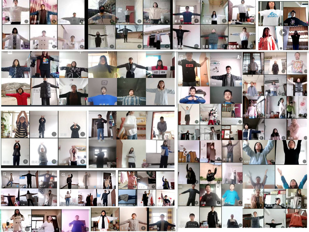 2月16日,本学期在线教学启动的前一天,学院在前期工作基础上,基于学生在高强度的网上学习期间更需锻炼、开学后学院强制学生锻炼有制度依据、学生锻炼需要外力督推等认识,向全院学生推送了学院《关于延期开学期每日9点55分以班为单位集体做广播体操的通知》,要求各班在周内每天上午的两大节课课间,利用学院网上视频会议平台组织本班同学集体做第九套广播体操,出操情况按学校有关规定计入学生综合素质考评积分。此项安排得到了学生和各班辅导员的积极响应,截止目前,除个别学生因网络环境不稳定或临时有事请假未能按时间参加集体做操外,大部分学生,特别是一、二、三年级学生都能充分利用自己家的客厅、小院等场地,每天坚持和本班同学一起同时在网上面对面做操。辅导员也不定期和学生一起做操,起到了监督检查、活跃气氛的作用。目前,此项活动仍在继续。