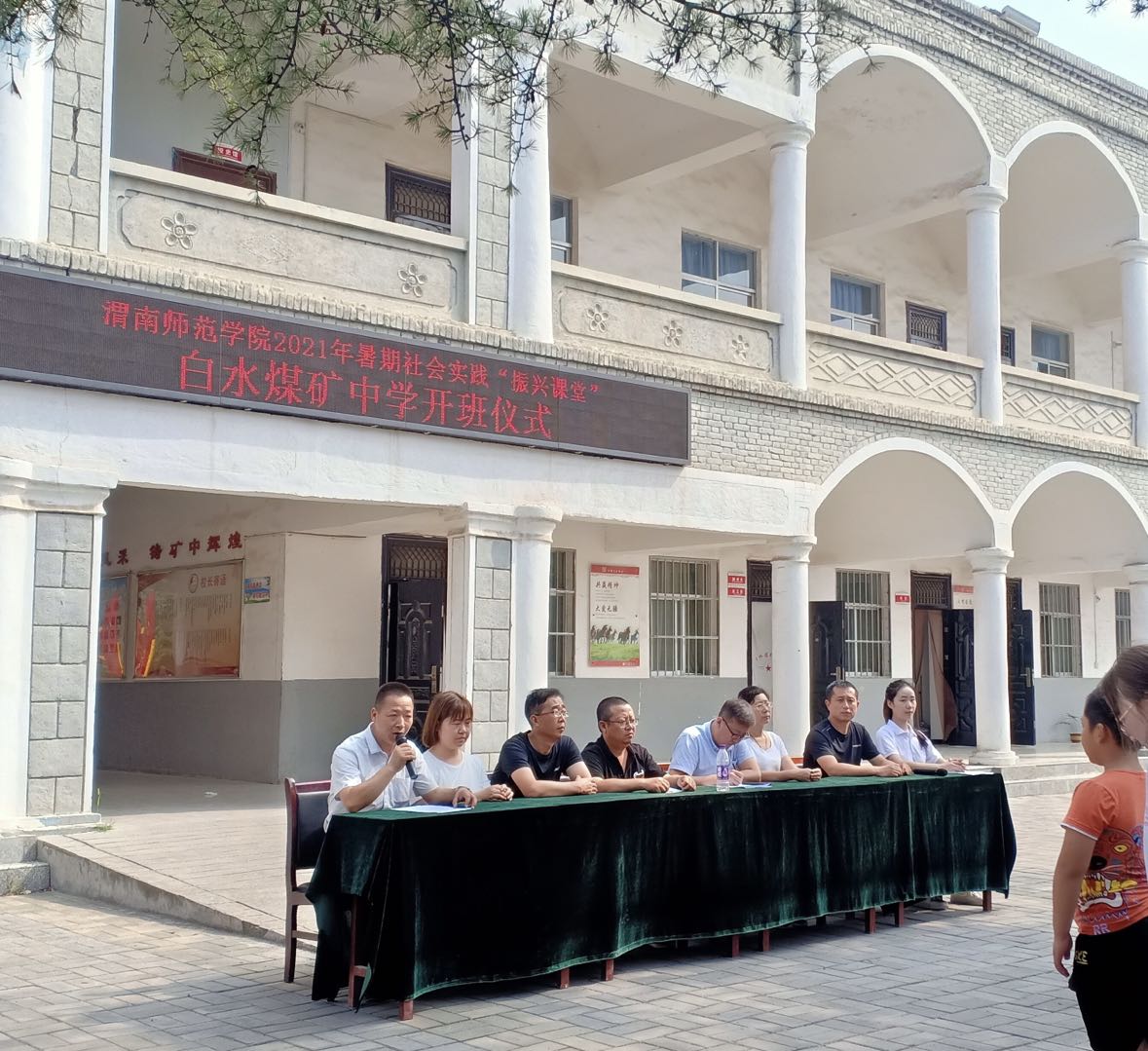 7月17日,在白水煤矿中学举行渭南师范学院2021年暑期社会实践“振兴课堂”白水煤矿中学开班仪式,由“振兴课堂”实践团队长王子茵主持,煤矿中学副校长杨永辉致欢迎词,他希望,在接下来的支教活动中实践队员和同学们能一道为乡村教育发展夯实基础做出贡献。肖飞强调,在实践中各位队员一定要以学生的教育与安全为核心,将所学专业知识融入教学中,深化育人实效。