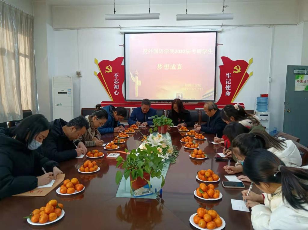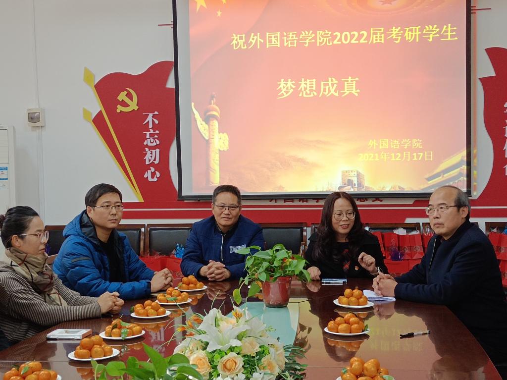 12月17日下午,外国语学院召开2022届考研学生加油鼓劲会。学院党政负责人、辅导员、2022届考研学生代表参会。会议由党总支副书记、副院长高军强主持。