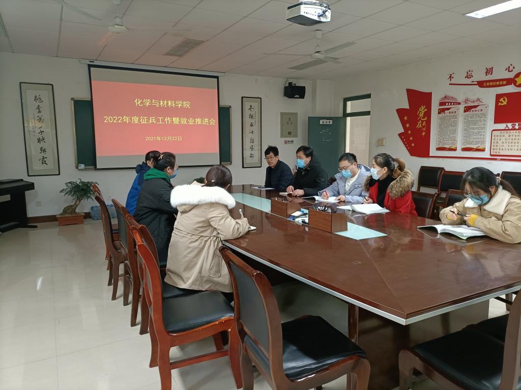 12月22日上午,化学与材料学院在会议室召开2022年度征兵暨就业工作推进会,学院领导班子和全体辅导员参加会议。会议由党总支副书记任晓婷主持。