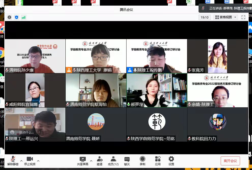 12月30日,教育科学学院学前教育专业负责人蔡海怡、专任教师聂娇、田力力、孙少康受邀参加了由陕西理工大学牵头,省属院校间联合举办的2022年学前教育专业人才培养方案修订线上研讨会,会议由陕西理工大学祝传鹏老师主持。