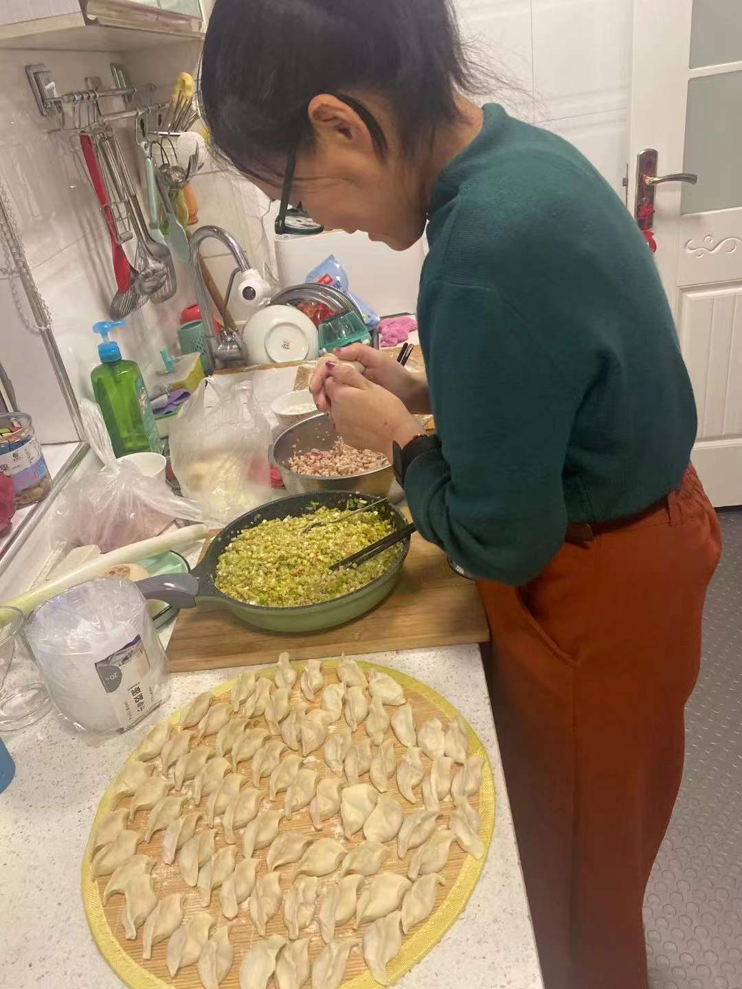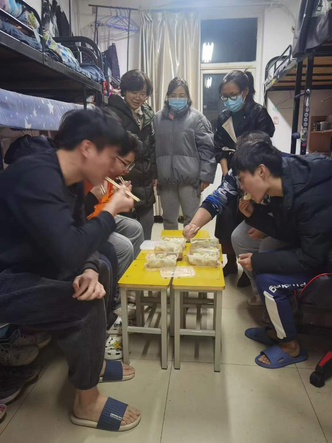 学院赵维、李芳菊两名志愿者老师在听闻有学生生病后,主动前往菜市场购买新鲜食材,亲自和面、调馅、擀皮,用自己的拿手花样包出一个个皮薄馅足、精致营养的饺子。晚6时许,两位老师端着热腾腾、香喷喷的饺子来到宿舍,关切询问学生豆新刚身体恢复情况、持续时间,鼓励他安心学习、科学防控。同时送来了防疫物资和生活物资,带给学生满满的关怀和深深的情意。豆新刚同学说:吃着味道鲜美、热气腾腾的饺子,像是感受到了家的温暖!