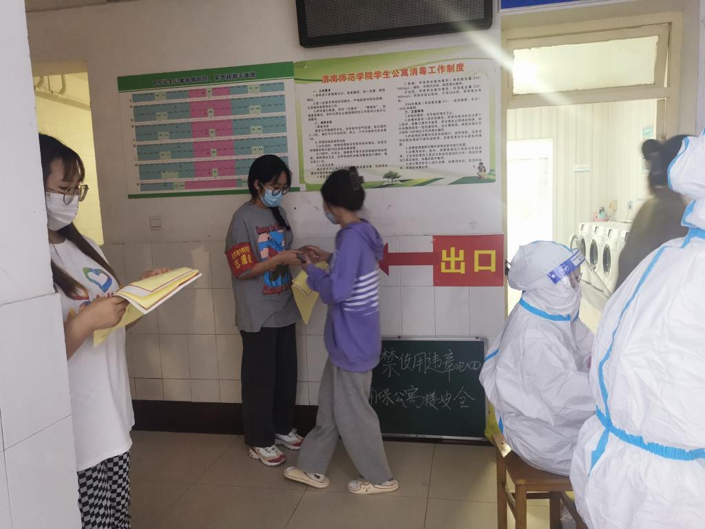 组织片区长走访宿舍让每位舍长加入相关的片区群,并宣传非必要不离开宿舍、不相互串门、勤洗手、多通风、戴口罩的等防疫政策;带领同学们充实宿舍文化生活,缓解同学紧张情绪,用自身行动影响大家积极配合学校做好疫情防控工作。同时协助校医院开展核酸采集工作,组织同学们有序采集核酸并离场,保持一米距离,检查并发放核酸帖纸。