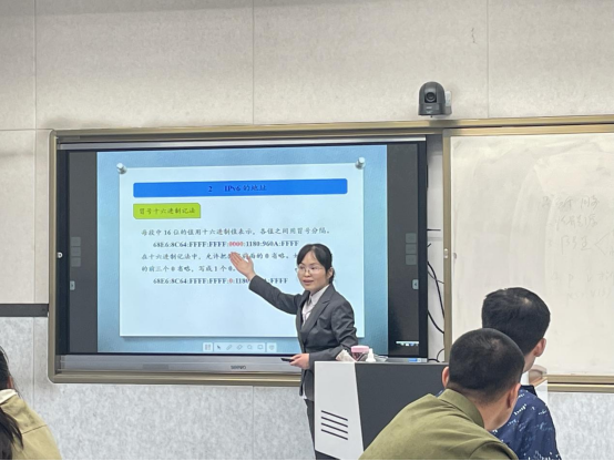 贾花萍老师以“计算机网络”课程中IP地址的发展演变为主线,分析了IPV6地址出现的原因及IPV6地址的格式、特点、书写方式等方面的知识。并利用分组讨论等方式在融入介绍了华为公司在网络发展过程中的作用。把爱国爱党的思想情怀、互帮互助的精神融入专业知识,把拼搏实干、奋斗自强的人生哲理融入课堂教学,在润物无声中实现了思政内容与专业知识的交互融合、高效协同。