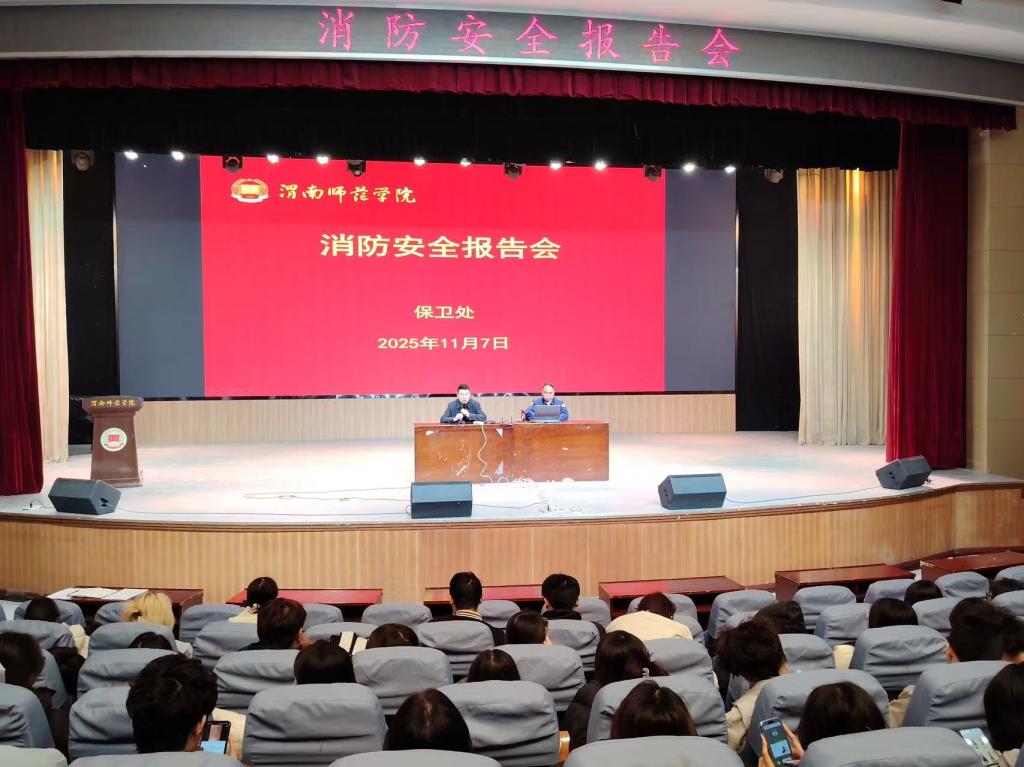 保卫处邀请到渭南市高级消防工程师张勤学、富平县消防支队干部张振川,为朝阳、富平校区师生作专题报告。报告会以"校园火灾隐患识别与应对"为主题,结合近年来高校火灾典型案例,深入剖析了实验室违规操作、宿舍私拉电线、电动车违规充电等常见隐患,并详细讲解了初期火灾扑救、火场逃生要诀等实用知识。朝阳、富平校区会场同步开展,实现两校区1000余名师生全覆盖学习。