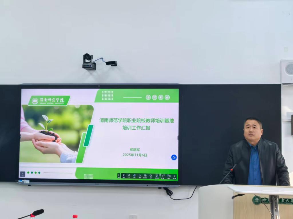 苟鹏军在发言中详细阐述了我校职业院校教师培训基地的建设经验。他表示,基地始终坚持“学校统筹、专家领衔、学院实施”的核心架构,积极整合校内外名师、行业领军人才与非遗传承人等优质师资,建立健全培训管理制度体系。通过院校对接、企业走访、学员问卷等多渠道调研,精准把握职业教育教师教学能力短板,构建起“训前精细化筹备、训中高质量实施、训后闭环式管理”的全流程培训模式。他还重点介绍了我校发挥师范院校特色,在公共艺术、电子商务等领域开展培训的先天优势与创新做法。
