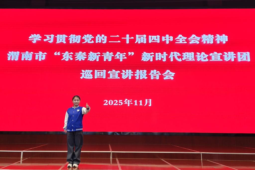 11月19日至27日,学习贯彻党的二十届四中全会精神渭南市“东秦新青年”新时代理论宣讲团深入渭南市11个县(市、区)和渭南高新区、渭南经开区开展巡回宣讲活动。我校雷锋宣讲团成员、外国语学院团委书记伍萌参与宣讲11场,雷锋宣讲团成员、环境与生命科学学院生物科学243班学生李敏莺参与宣讲2场,在本次巡回宣讲活动中获得广泛好评。