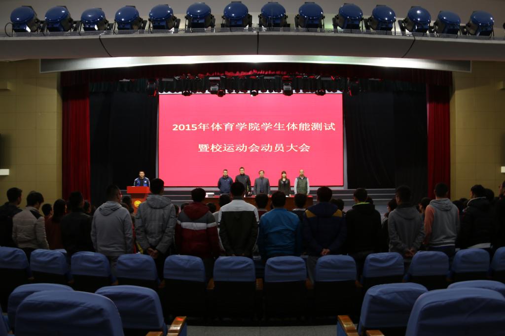 3月25日,体育学院全体学生在陶然楼演艺厅参加《体育学院学生体能测试暨校运动会动员大会》。参加会议的老师有院长张虎、院长助理李春兰和刘正武、运动会团体操编导陈伟龙,陈学东秘书,会议由办公室主任杨枭主持。