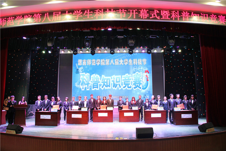 开幕式后,我校大学生科普知识大赛决赛正式开始。大学生科普知识大赛以深化全校学生知识、拓宽全校学生视野为目标,在“公平、公正、公开”的原则下,各二级学院和参赛学生的广泛支持下,通过层层选拔,经过初赛,复赛,来自化学与环境学院、商学院、教育科学学院、西岳校区教学部、外国语学院和人文学院的六支代表队进入了决赛。比赛设置了精妙绝伦的“选择题”,还有精彩纷呈的“抢答题”,“游戏答题”,以及考验团队默契的“车轮战”,“争分夺秒”环节。