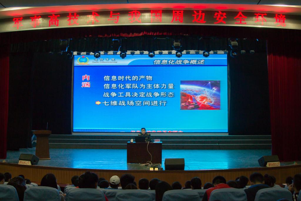 11月26日下午,我校在陶然楼演艺厅举办“我国周边安全环境、军事高技术及信息化战争”为主题的国防教育专题讲座。讲座邀请中国人民解放军边防学院学生军训教研室教授李新柱大校,教研室副主任杜空军中校主讲。参加讲座的有人武部部长崔启、各二级学院副书记、学工办主任。讲座组织学生代表480名参会。