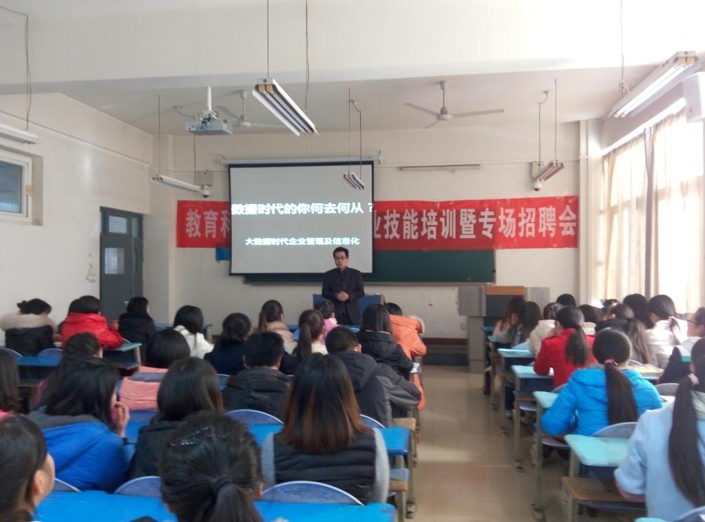 为提高毕业生就业技能,搭建毕业生与用人单位之间的联络平台,积极促进毕业生顺利就业,12月16日下午,教育科学学院在知新楼2216教室举办了毕业生就业技能培训暨专场招聘会。培训会邀请腾普科技有限公司李昕博士为毕业生做了题为《大数据时代下的大学生就业形势分析及就业能力提高》培训讲座,学院120余名毕业生参会。