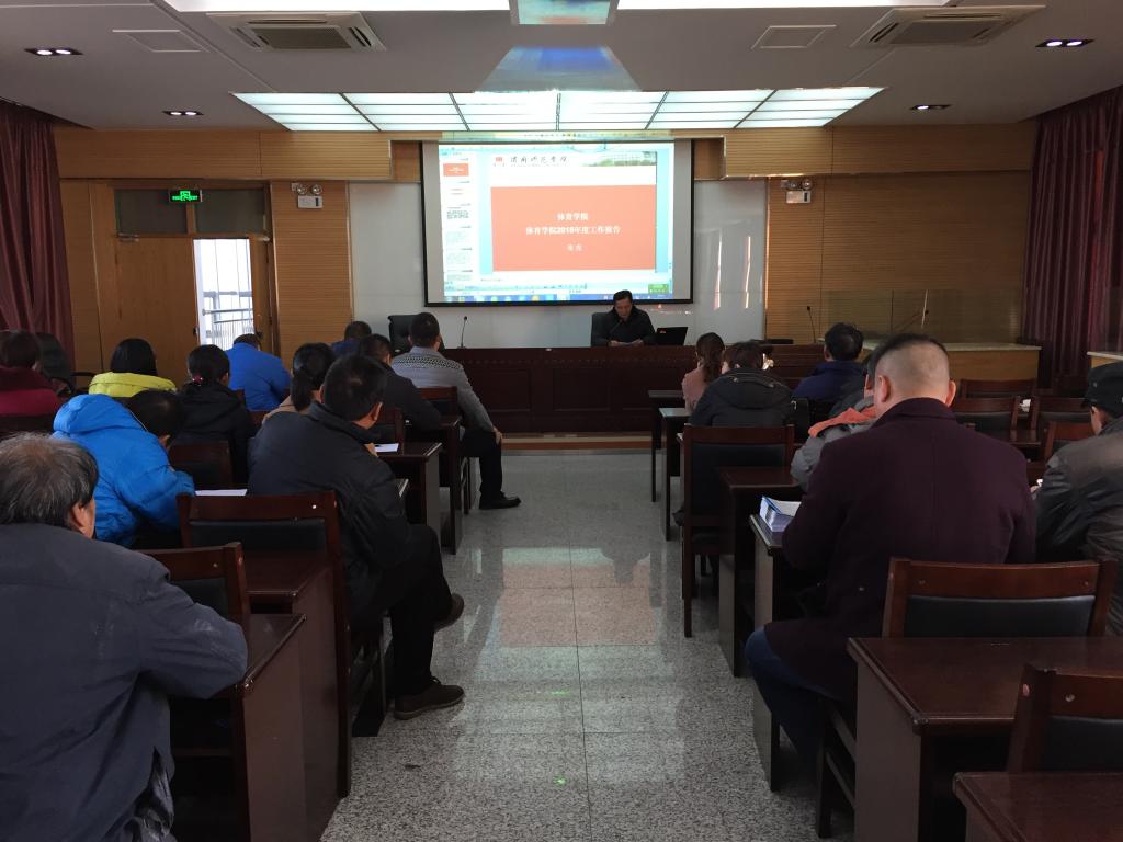 会上,院长兼党总支书记张虎代表学院党政做了2015年体育学院工作报告,对2015年度体育学院在学科发展、教育科研、课程建设、创新人才的培养、群体活动及赛事等方面做了汇报,详细回顾了学院一年来的发展和取得的成绩,阐述了2016年体育学院的工作设想,并对老师们一年的辛勤付出和对自己工作的支持表示衷心的感谢;院长助理刘正武做了关于学院津贴分配方案的报告,办公室主任杨枭做了学院财务工作报告,工会主席何小军做了工会年度工作报告并宣布闭幕。