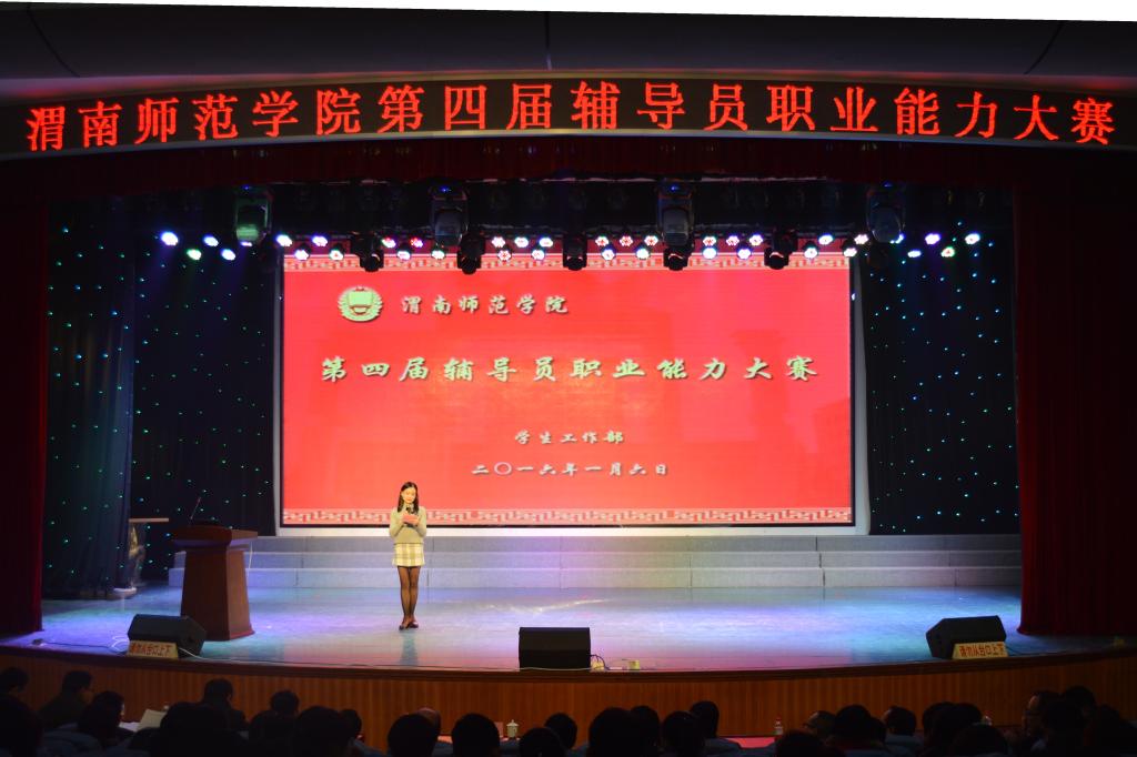 2016年1月6日下午,我校第四届辅导员职业能力大赛决赛在陶然楼演艺厅成功举办。学校党委副书记赵伏友、学校党委委员、组织部长杨小渭等学校领导观看比赛;宣传部、统战部、审计处、政策发规处、高教研究室等部门负责人观看比赛并担任评委;学工部、人武部、团委等部门人员、各二级学院分党委书记、党总支书记、副书记、全体辅导员及学生代表300余人观摩比赛。