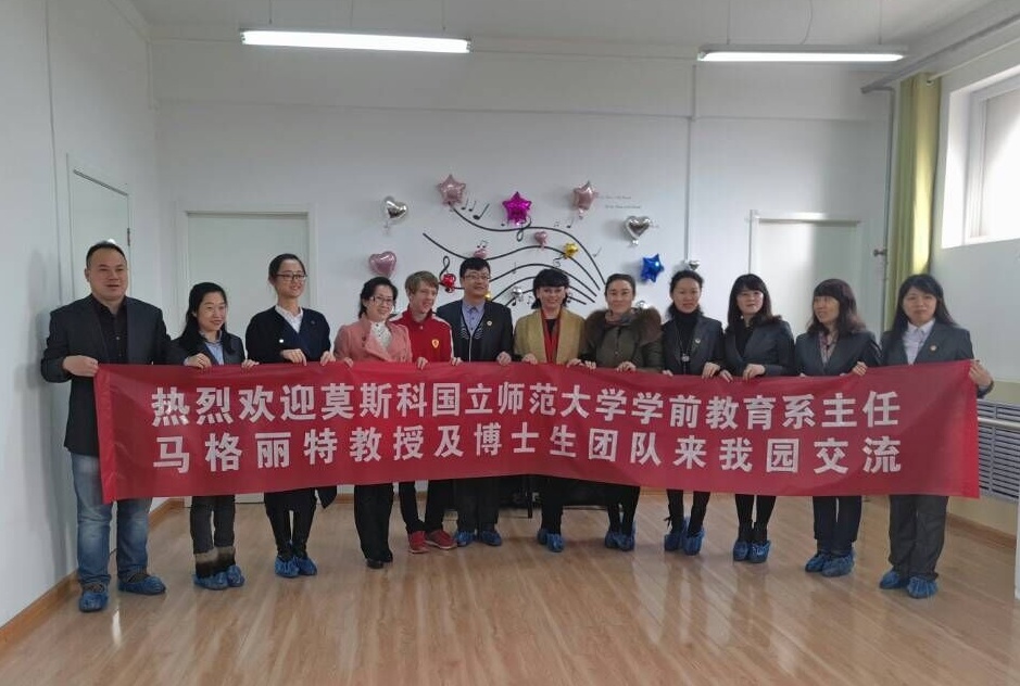 1月9日上午,莫斯科国立师范大学学前教育系主任玛格丽特教授到我校朝阳幼儿园学习交流。丝绸之路艺术学院院长梁晶、科技发展集团公司总经理王居海、学前教育专业博士生团队以及资产经营有限责任公司副总经理苟鹏军、幼儿园园长、外教Goseph等陪同。