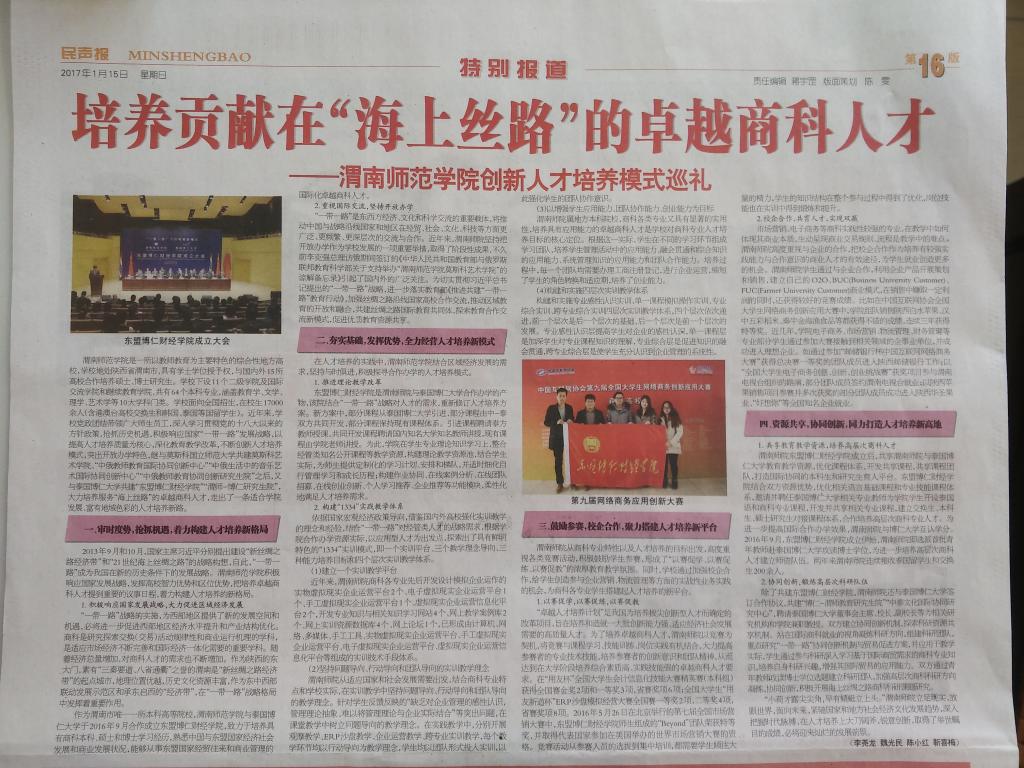 2017年1月15日,由陕西省人大常委会主办的《民声报》第1125期第16版全文刊发了我校东盟博仁财经学院《培养贡献在“海上丝路”的卓越商科人才——渭南师范学院创新人才培养模式巡礼》文章。